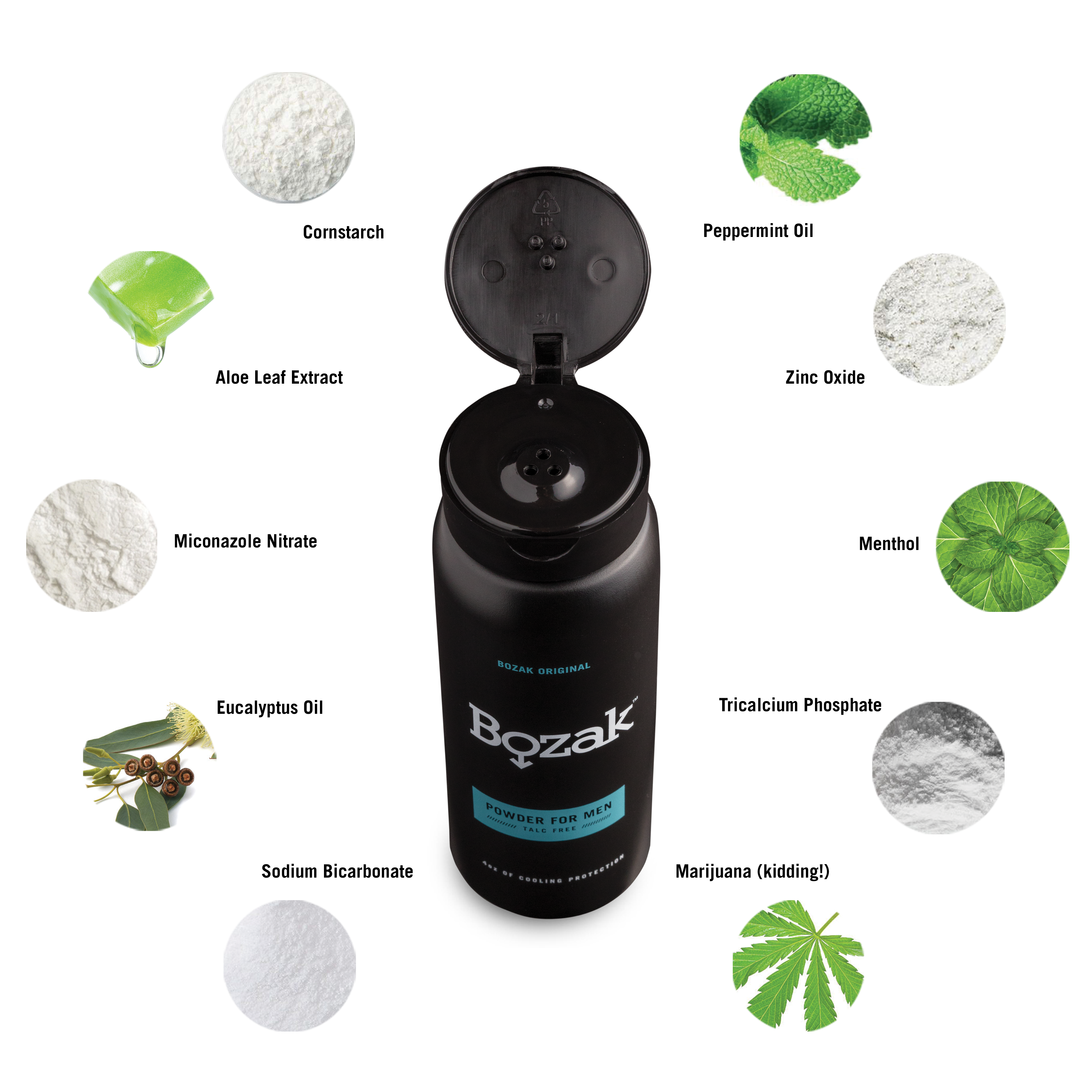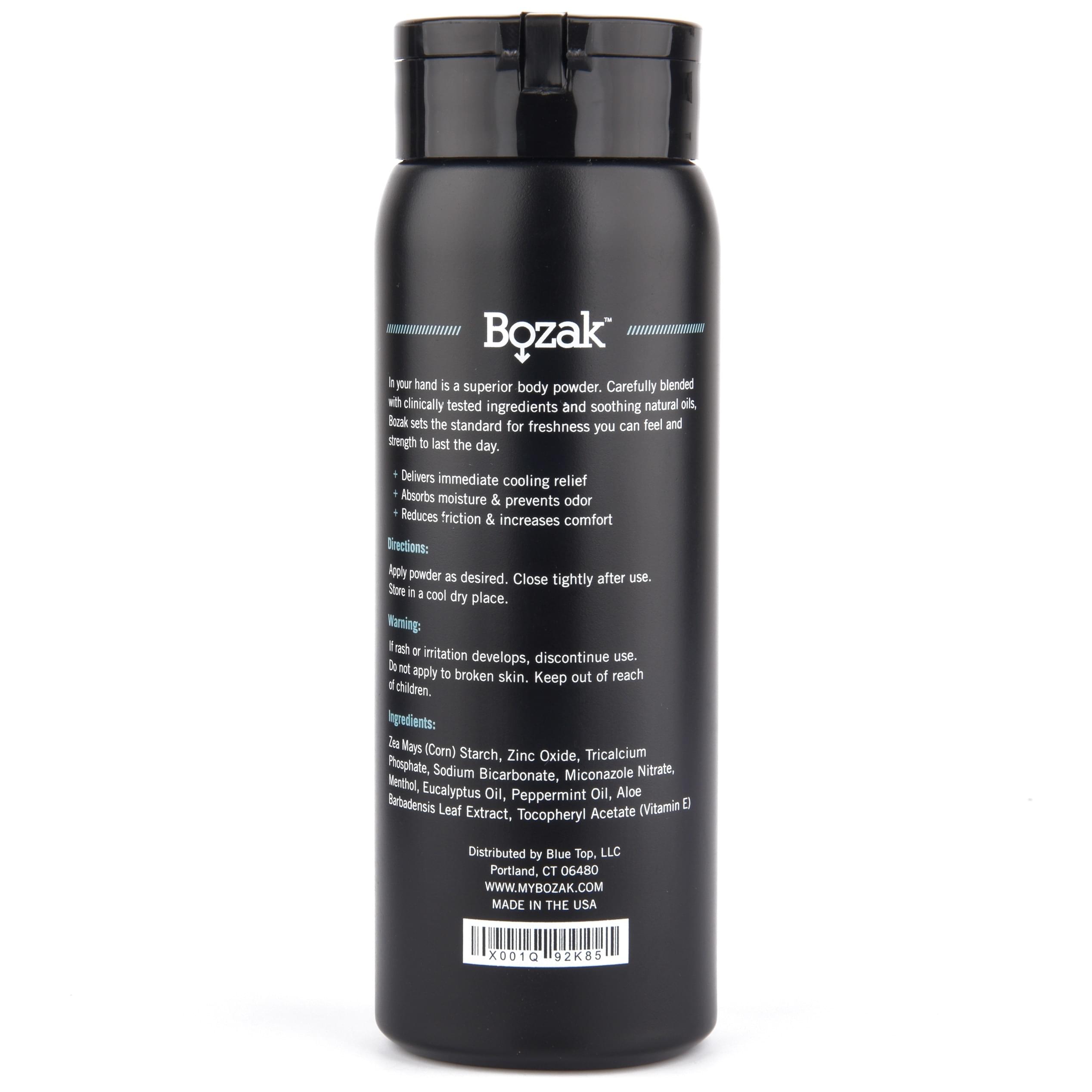 What’s so special about Bozak?A: Most body powders are mainly baby powder – that ain’t this, and this ain’t that. The unique blend of essential oils and clinically proven ingredients cannot be found outside a Bozak bottle. Bozak stops friction, kills odor, absorbs moisture, reduces itching, and helps protect skin from fungal infection in ways that other products just can't.